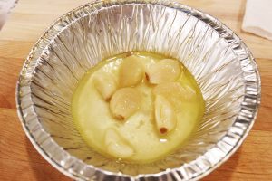 - Place 6-8 cloves garlic in an oven proof dish. Add 1/3 cup chicken stock and 2 tbsp olive oil and cover tightly with aluminum foil and set on a sheet pan.