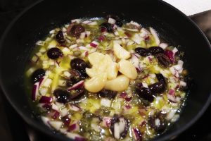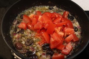 - Add 1/2 medium finely diced red onion, 1/2 cup sliced kalamata olives, the zest of 1 large lemon, 1/3 cup capers, and 1 tbsp dried thyme to the small skillet. Stir to combine and sauté over medium heat for 8-10 minutes or until the onions begin to soften.