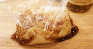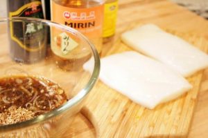 - Combine 1 medium shallot, 1 large grated garlic clove, 1 tsp grated ginger, 1 tbsp toasted sesame seed oil, 3 tbsp soy sauce and 3-4 tbsp Mirin and mix well to blend.