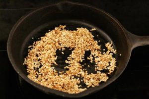 - Toast 1/3 cup sesame seeds until golden in a small killet over medium high heat.
