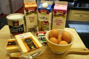 - Combine half and half, cream, sliced green onions, and 5 whole eggs, salt and pepper and pour over the grits, sprinkle chopped crisp bacon over the top.