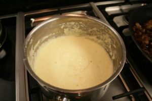 - Remove from heat and stir in 1 cup of the cheese, allow to stand for about 10 minutes and then stir in one whole egg.