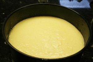 - Spread mixture on the bottom of the cake pan previously sprayed with cooking spray.