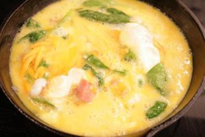 - Pour whipped eggs over the mixture, running a spatula around the edges of the pan to allow the egg to get under the mixture and then place in a 425° degree oven for 20-25 minutes.