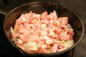 - Add chopped onion and cubed ham and sauté over medium heat until onions are soft, about 5-6 minutes.