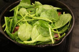 - Wash and add 1 handful baby spinach to the onion and ham mixture, mix to combine and sauté with ham and onions until the spinach begins to wilt.