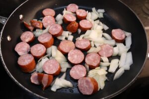 - Add 1 tbsp olive oil to a medium sized skillet over medium heat and add 1/2 medium chopped onion and 1/2 lb sliced smoked sausage or kielbasa to the pan. Sauté until the sausage and onion begin to brown.