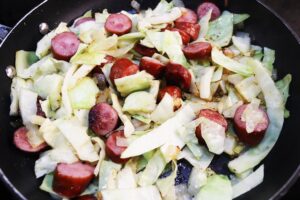 - Add 1/2 small head white cabbage, chopped into 1" squares, and 1 medium white potato, previously parboiled, to the onion mixture. Season with kosher salt and freshly ground black pepper. Toss to combine and sauté for about 5 minutes or until the cabbage has softened.