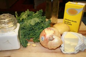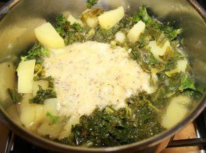 - Add a ladle or two of chicken stock from the kale and potato to the roux, stir to combine, then add the roux all at once to the kale and potato mixture and stir until combined with the stock and the vegetables.