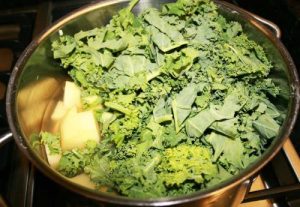 - Combine potato and kale in a medium sauce pan and add chicken stock to barely cover potatoes.