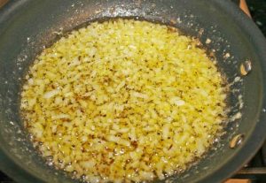 - Heat oil and butter in a frying pan over medium heat and add the finely chopped onion and marjoram and sauté until the onion is soft and translucent about 3-4 minutes.