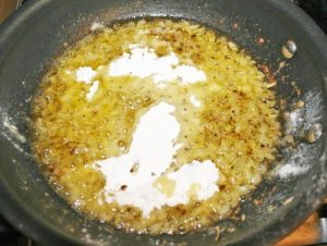- Add flour to onion mixture and make a light colored roux, about 2-3 minutes over medium high heat. Remove roux from heat and grate in one clove of garlic stirring into the roux, but still off the heat