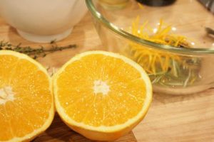 - Zest and juice 1 orange and add with 2 tbsp balsamic vinegar to the bowl with the herbs and cherries. Season with kosher salt and freshly ground black pepper. Combine well and heat in a microwave safe dish on high for 1 minute.