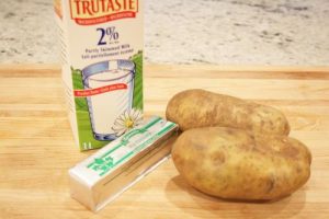 - Peel and cube 2 medium or one large baking potato so that they are all the same size.