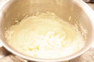 - Drain the water, add 2 tbsp unsalted butter, and beat on high with a hand mixer until the potatoes have been broken up.