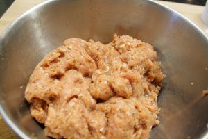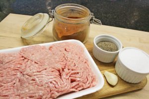 - Combine 1 lb ground pork, 2 cloves grated garlic, 2 tspn paprika, 1 1/2 tspn ground black pepper and 1 tspn kosher salt in a mixing bowl and mix, using a kneading motion with your hands until all ingredients are evenly combined.