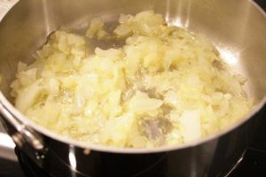 - Peel and finely chop 1/2 of a sweet onion and sauté until the onions are translucent, about 5-6 minutes, then add grated garlic and stir to combine.