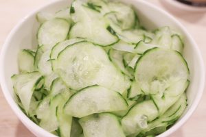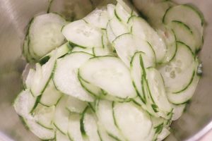 - Place sliced cucumber in a bowl and combine with 1/4 tspn kosher salt and after 15 minutes, squeeze out extra juice. Reserve cucumber.