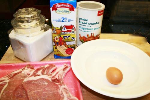 - One pork chop at a time, turn the chop in flour, then both sides in the egg wash, and lastly, cover both sides in panko or bread crumbs.
