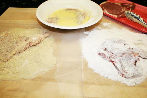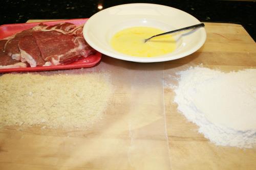 Tip : If using pork chops, try to get the very thin 'fast fry' cut, otherwise it's best to use a meat mallet to thin regular cut pork chops to about 1/4" inch before breading. This will increase the size of the chop but will ensure that the chop stays moist. Cut slits in the fat edges to prevent the meat from curling up when frying and to allow the meat to be flattened out.