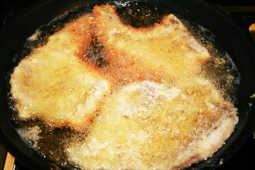 - Pour a generous amount of vegetable oil in a large frying pan, the oil should be almost as deep as the thickness of one of the pork chops. There should be enough oil so that the oil reaches up most of the sides of the pork chops but does not cover the top.