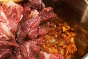 - Add cubed beef to onion mixture and stir well to combine. Cook on medium high heat until the beef loses it's color, about 4-5 minutes, then reduce heat to medium low and cover with a lid. Cook for about 2 hours, or until the meat is very tender. Remove hot pepper and discard just before serving.