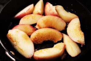 - Lightly spray a small skillet with vegetable oil spray and heat the skillet over medium high heat. Cut each of the 2 whole peaches into 4 to 6 wedges each and place cut side down in the skillet. Sear for a minute or two or until the peaches begin to get golden. Then turn and repeat for second side. Remove peaches to a plate and reserve.
