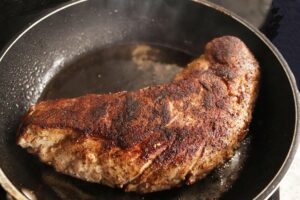 - Heat the same skillet over medium high heat for 1-2 minutes. Then add 1 tbsp butter to the pan and place the seasoned tenderloin on the melted butter. Sear the tenderloin for 4 minutes without disturbing. Turn and sear the second side for 3 minutes. This should yield a medium to medium rare tenderloin. Remove tenderloin from the pan, transfer to a plate and allow to rest for 10 minutes and then slice into 3/4" thick slices.
