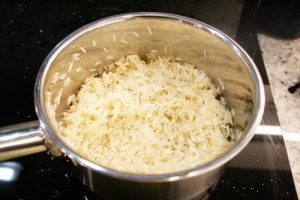 - Heat a 1 tbsp oil in a small sauce pan, add 1 cup rice and stir until well coated. Add just enough water to cover and simmer on medium high heat until the rice has absorbed all the water, about 5 minutes. Remove from heat and set aside.