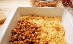 - When all components are cooked, create layers in an oven proof dish, starting with a layer of sauerkraut, then ground pork and rice and repeat ending with sauerkraut.