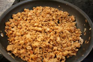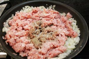 - Cook pork mixture over medium high heat until the pork has lost its color and the onions are soft, about 15 minutes. The pork does not have to be cooked through but should have a crumble consistency. Remove from heat and stir 1 1/2 tbsp Hungarian paprika.