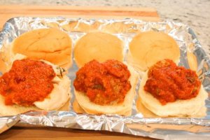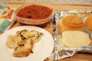 - Slice meatballs in half and top the chicken with the meatball slices and then top the meatballs with 1 tablespoon of red sauce.