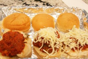 - Remove the sheet pan, uncover, flip the top bun over, and generously mound half of it with grated mozzarella cheese.