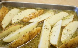 - Place potatoes cut into wedges in a roasting pan, drizzle with a bit more olive oil. Season well with kosher and salt toss to combine. Add olive oil mixture to roasting pan and toss potatoes to coat evenly.