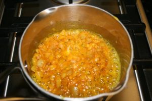 - Add turmeric and then rice and allow to sizzle for a couple of minutes.