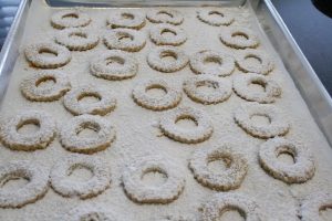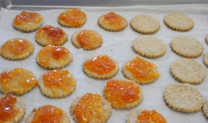 - When cool, put a dollop of apricot jam on the side of cookie without the hole in the center, spread the jam to the edges.