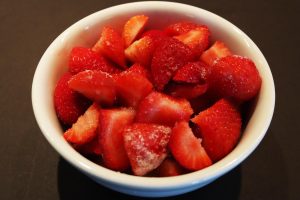 - Add 1 lb fresh strawberries hulled and sliced into a small bowl.