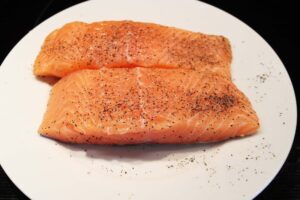 - Season 2 salmon filets with kosher salt and freshly ground black pepper. Set aside until ready to cook