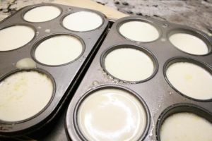 - Spray each mini muffin tin with vegetable spray.