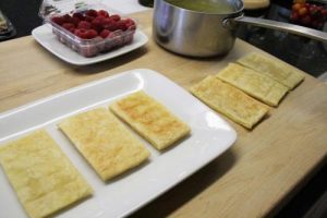 - Top pastry cream with raspberries, maybe 6 per pastry sheet, just enough to make 2 rows sitting in the cream.