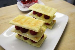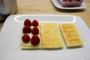 - Top this layer with another pastry slice and repeat the cream and another 6 raspberries.
