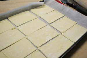 - Dust board with flour and roll out puff pastry to about an 11 x 16 rectangle.