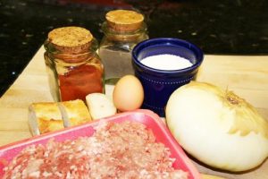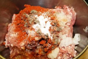 - Mix ground pork, chopped onion, grated garlic, paprika, black pepper and salt in medium mixing bowl.