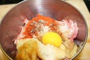 - Mix all ingredients together by hand. Do not over mix, just enough to blend in pepper, paprika salt and egg.