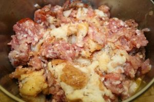 - Add one whole egg and squeeze water from stale bread and add to pork, or if using fresh bread crumbs, add to pork.