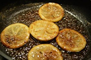 - Heat 2 tbsp the canola oil in a medium skillet over high heat, when hot (1-2 minutes) add slices of lemon and cook until the lemon slices become a golden brown.