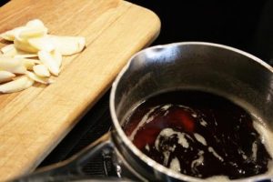 - Peel and slice 6 gloves of garlic into very thin slices.