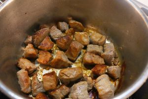 - Add 1 lb stewing veal or beef and season with kosher salt and freshly ground black pepper. Do not crown the meat, make two batches if necessary. Sear each side until lightly browned. About 4 minutes per side. Transfer to a plate.