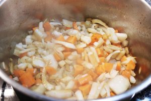 - Add the remaining 1 tbsp of oil and add 1 medium finely chopped onion and 1 medium finely chopped carrot. Stir to combine, cook until the vegetables begin to soften, about 5 minutes.