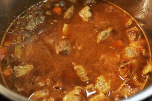 - Return to the heat and deglaze with 1 cup beef broth and 2 strips lemon peel and return the seared meat to the pan.